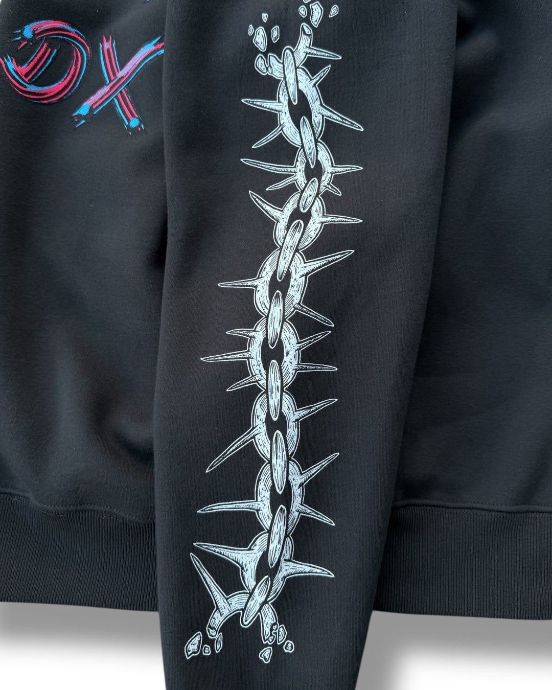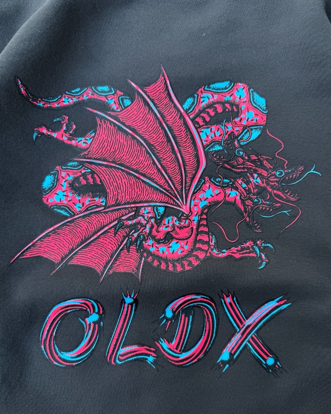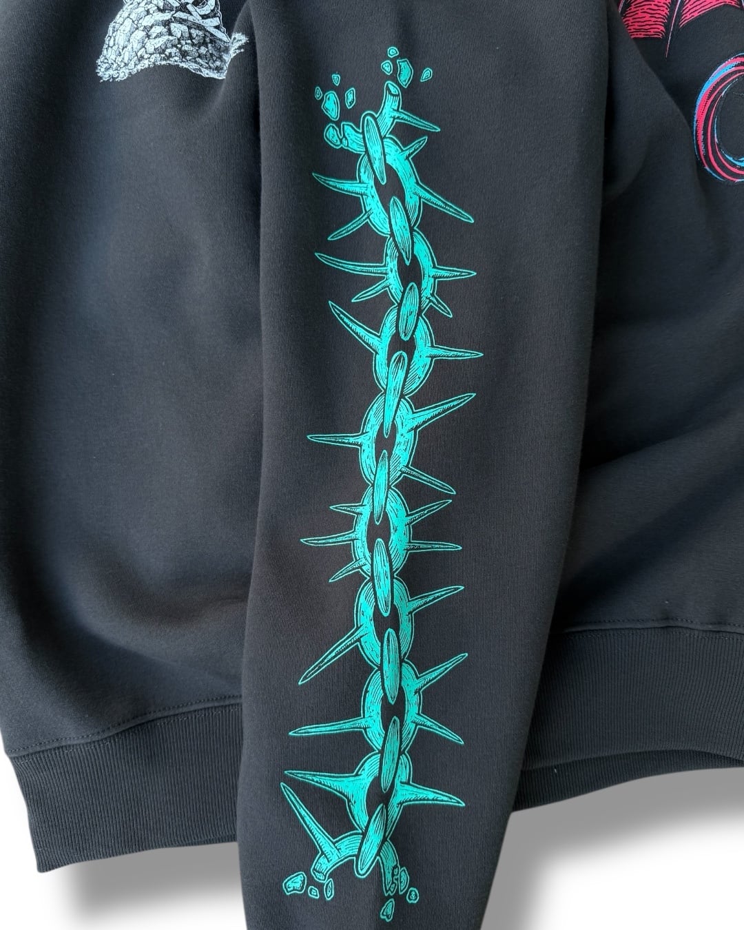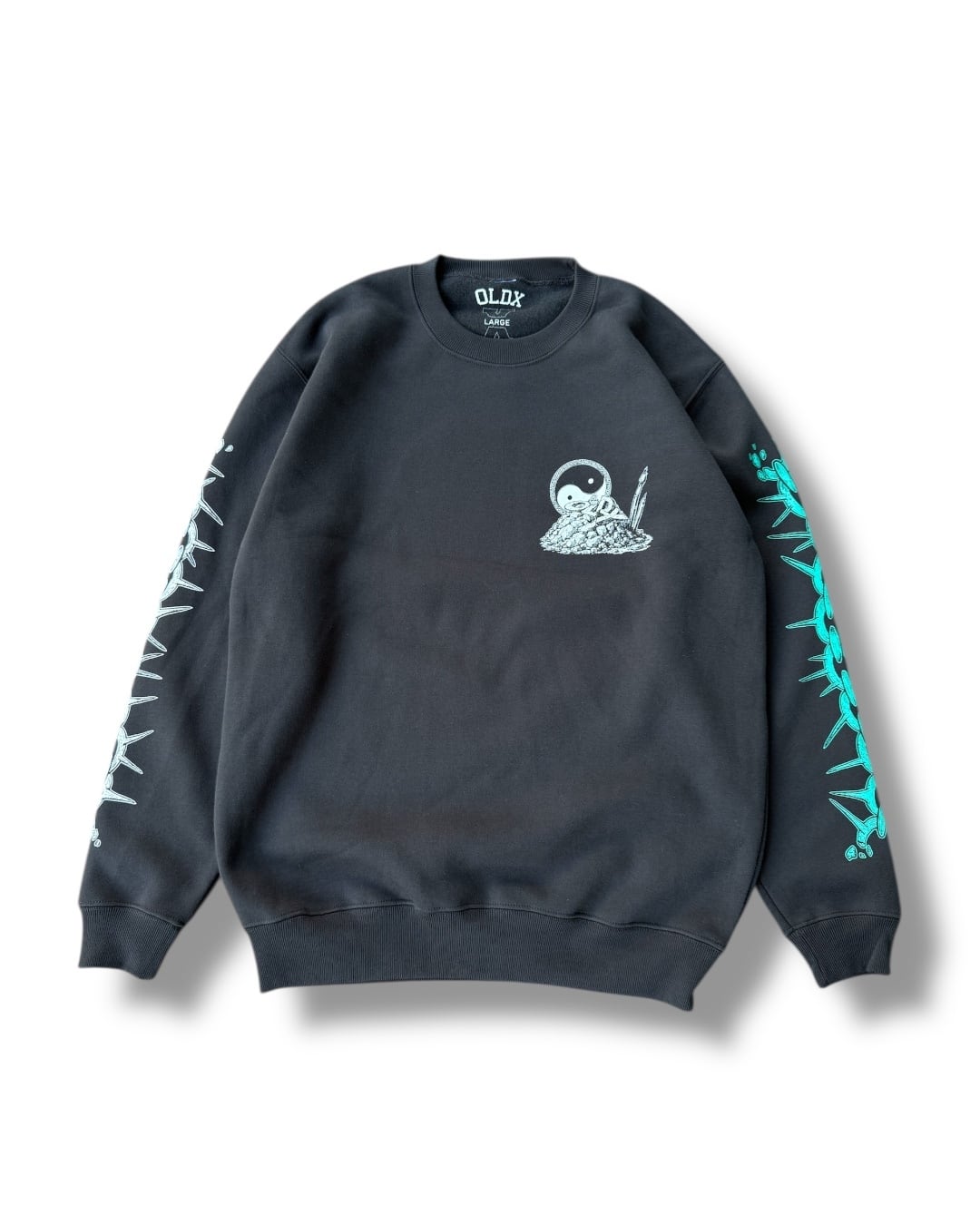 クラシックな90sを感じるドラゴンのデザインがバックに、スリーブにはチェーンデザイン、フロントは瓦礫と陰陽がデザインされております。