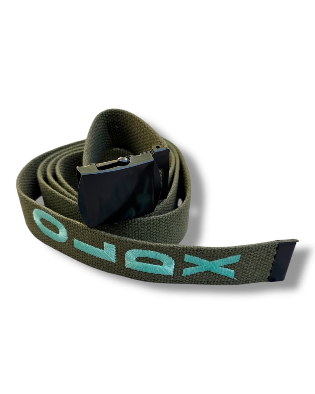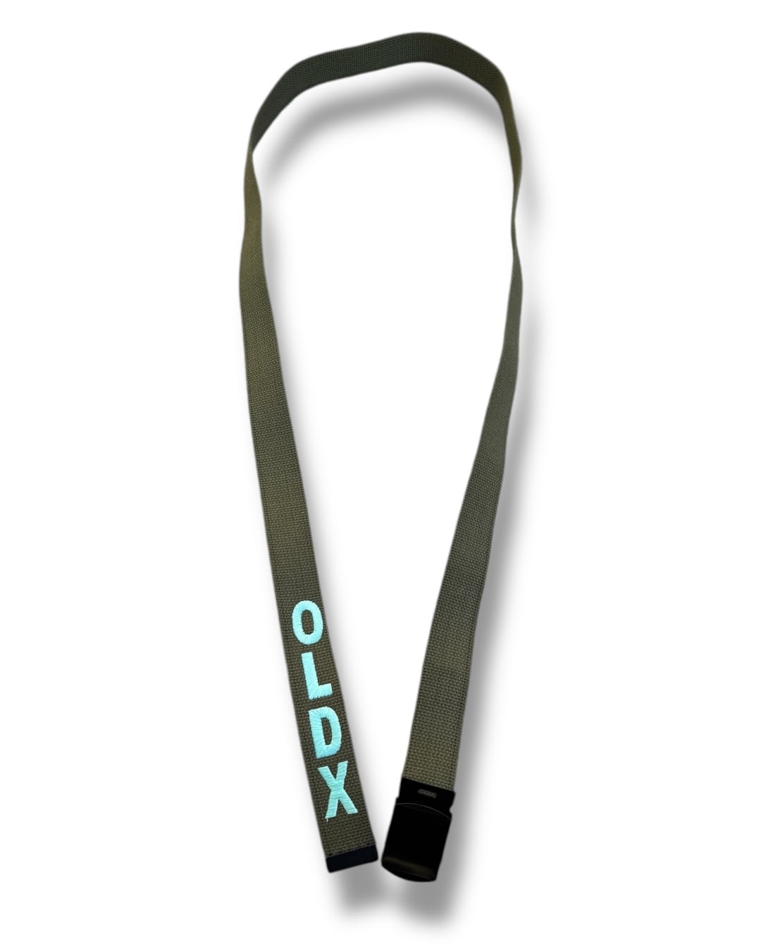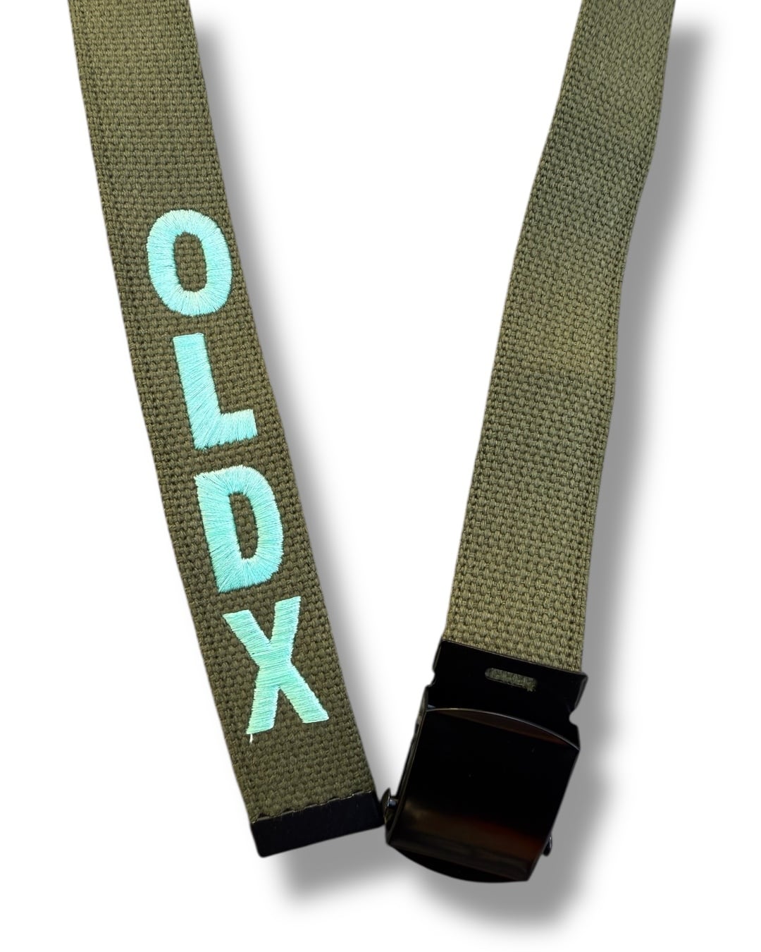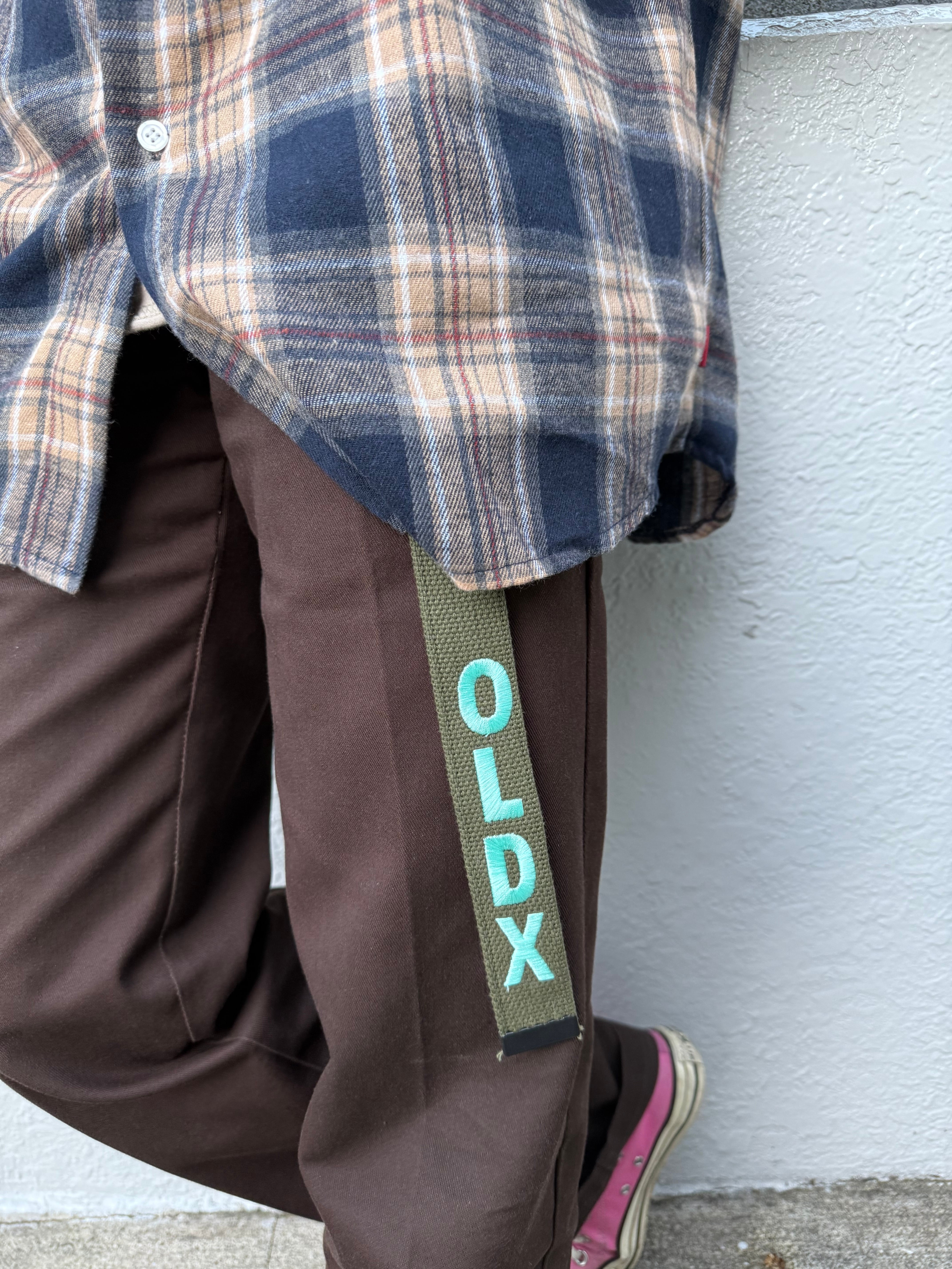 先端にはOLDXのロゴ刺繍が施されたシンプルなベルト。