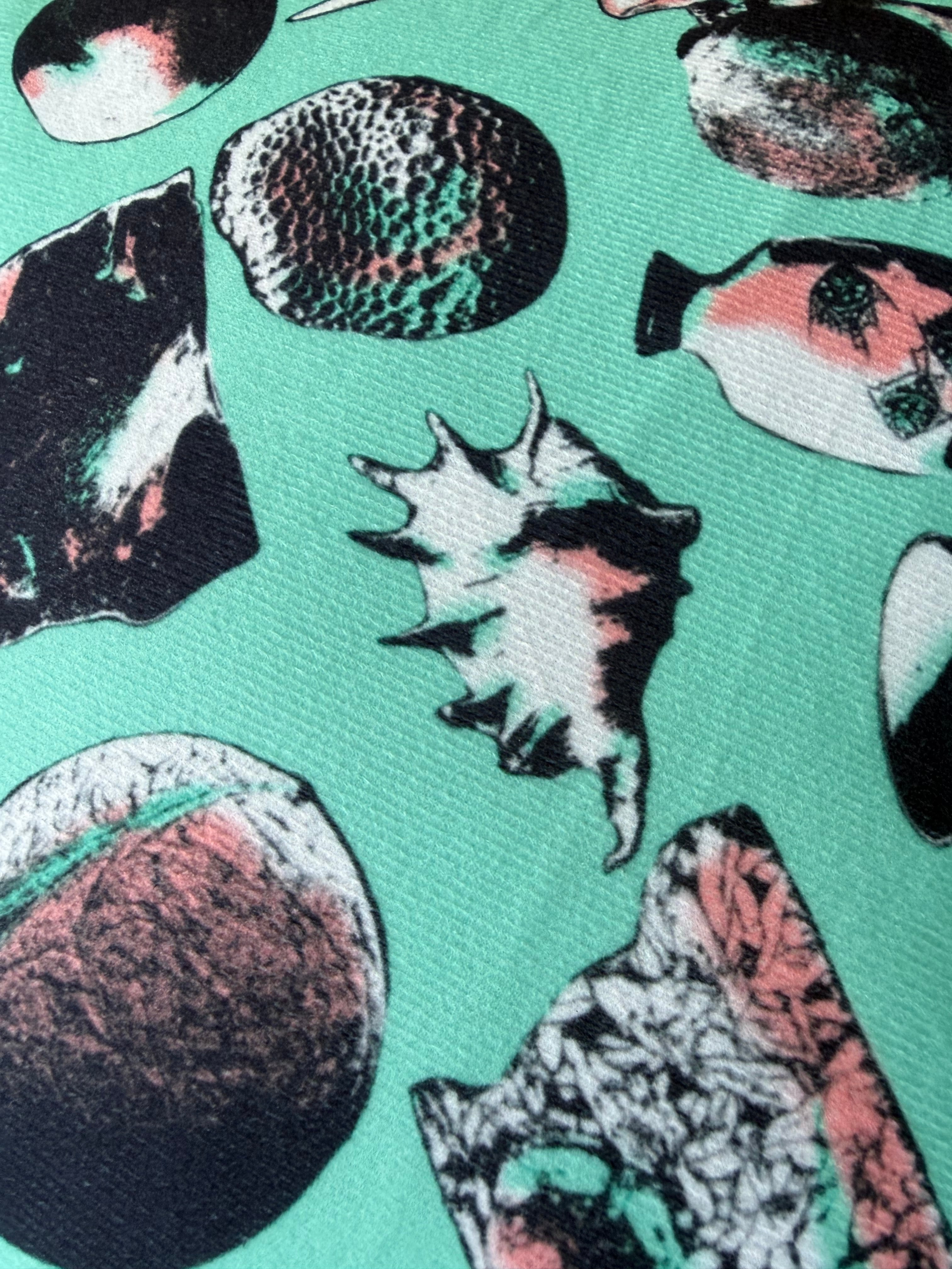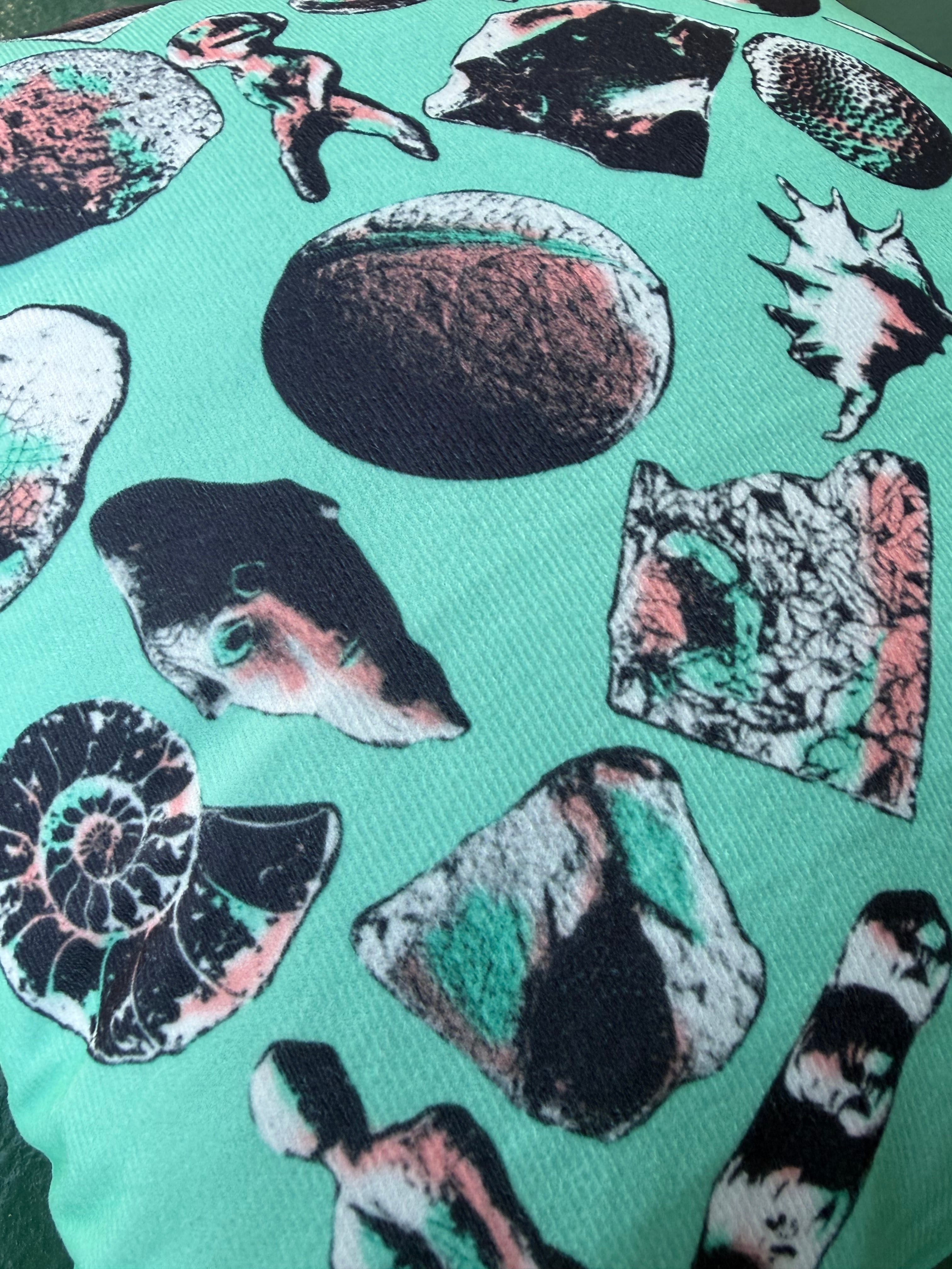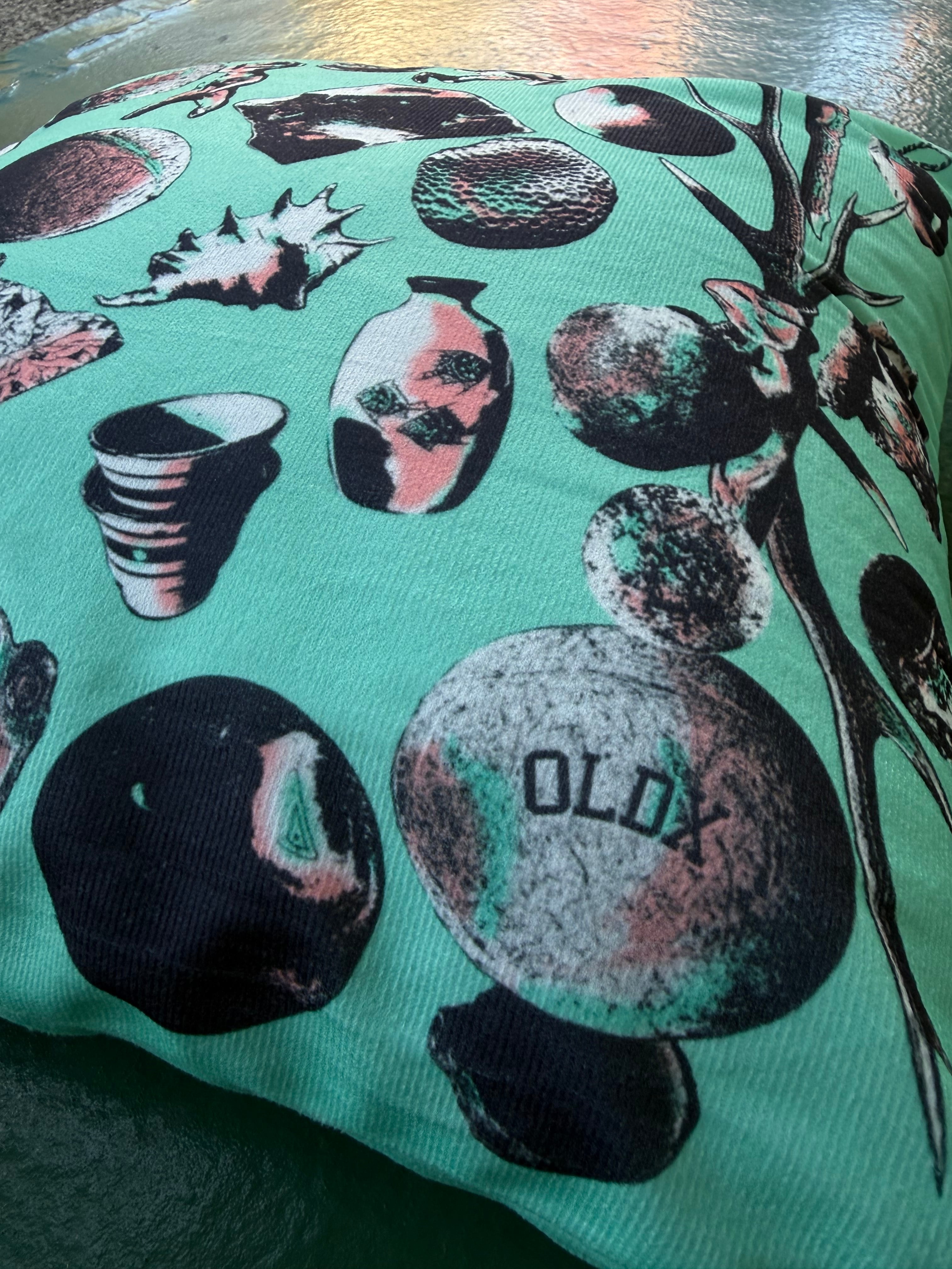 舞台芸術のアーティスト菊地もなみさんがコレクトしている古物たちをコラージュして作られたクッションなります。